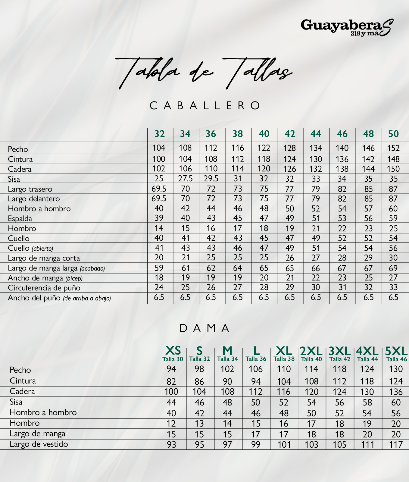 Debe de tomar las medidas de una guayabera o camisa extendida (no puesta) que use regularmente. En caso de tener una medida entre dos tallas, es preferible que seleccione la talla mayor.